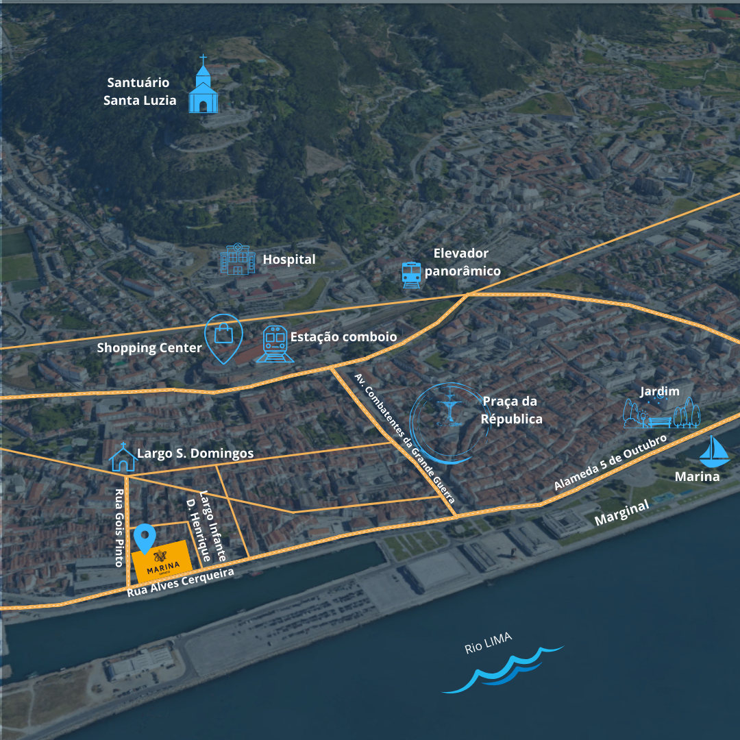Localização premium no centro histórico da cidade, em frente ao rio Lima e ao mar.